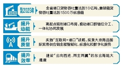 在提升港口发展动能方面,《方案》明确,我省将高起点规划全省沿海港口布局,推动港口群错位分工、一体化协同发展,合理预留港口岸线资源,完善码头、航道、锚地、内陆干港等基础设施布局。完善港口基础设施建设,加快大型化专业化码头泊位、航道锚地等公共基础设施、LNG接收站配套工程建设和老旧码头升级改造。完善港口服务网络,推动码头物流向全程物流延伸,发展“门到门”物流服务。