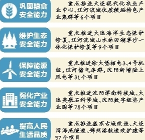 聚焦提升国防安全能力,重点推进6个项目。巩固粮食安全能力,重点推进阜新蒙古族自治县、昌图县高标准农田,普兰店国家级鲟鱼辽参数字化产业园,大连现代化农业产业中心,辽河流域优质粳稻特色产业集群等6个项目,总投资121亿元,2022年计划投资45亿元。维护生态安全能力,重点推进大连海洋生态保护修复、辽河流域山水林田湖草沙一体化保护修复、重点输供水盘锦应急支线、辽河干流防洪提升、引洋入连等9个项目,总投资349亿元,2022年计划投资85亿元。