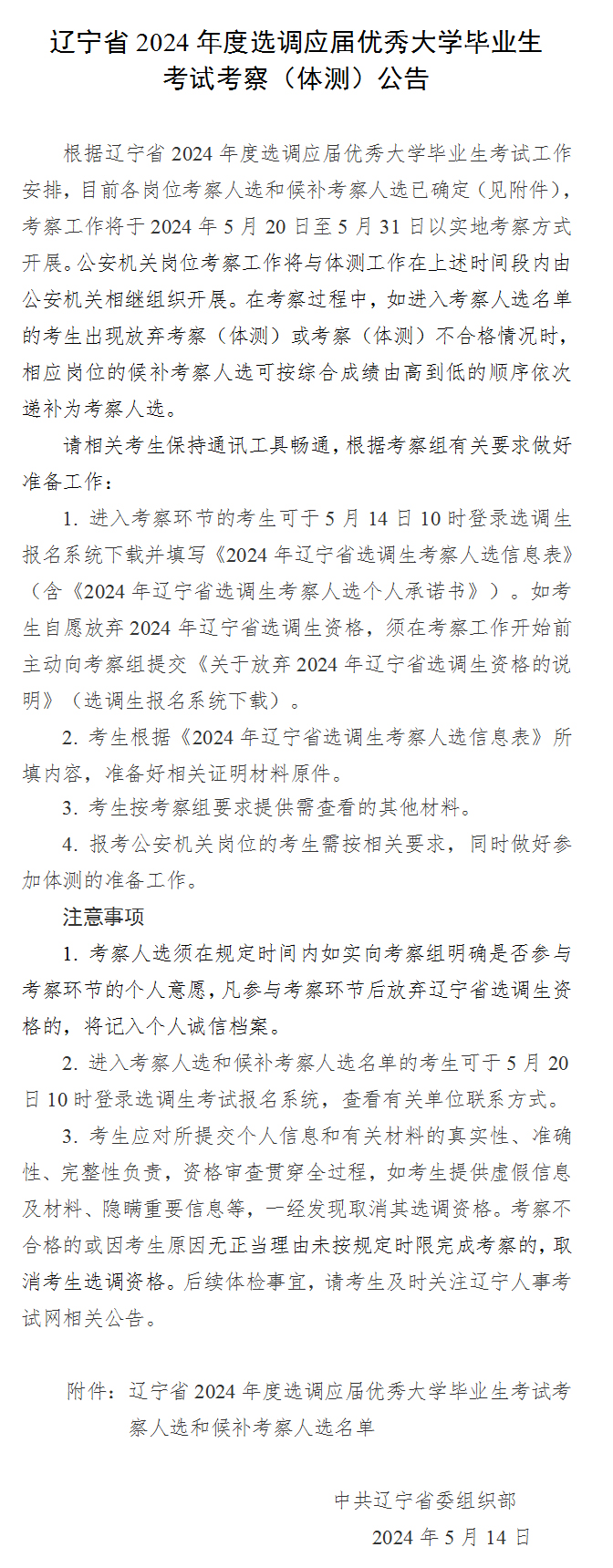 辽宁省2024年度选调应届优秀大学毕业生考试考察(体测)公告