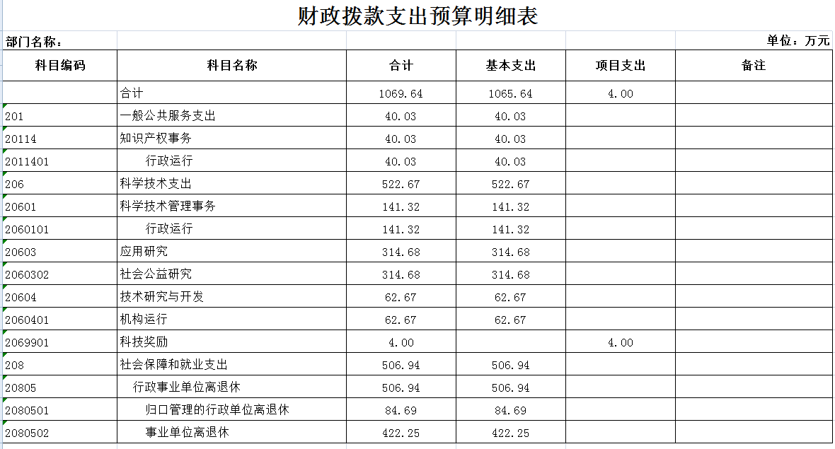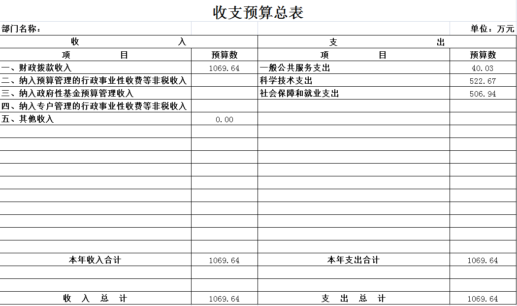 按照综合预算的原则,十大正规博彩平台科学技术局所有收入和支出均纳入部门预算管理。收入包括:财政拨款收入1069.64万元、纳入预算管理的行政事业性收费等非税收入和其他收入等;支出包括:一般公共服务支出40.03万元、科学技术支出522.67万元、社会保障和就业支出506.94万元。十大正规博彩平台科学技术局2016年收支总预算1069.64万元。