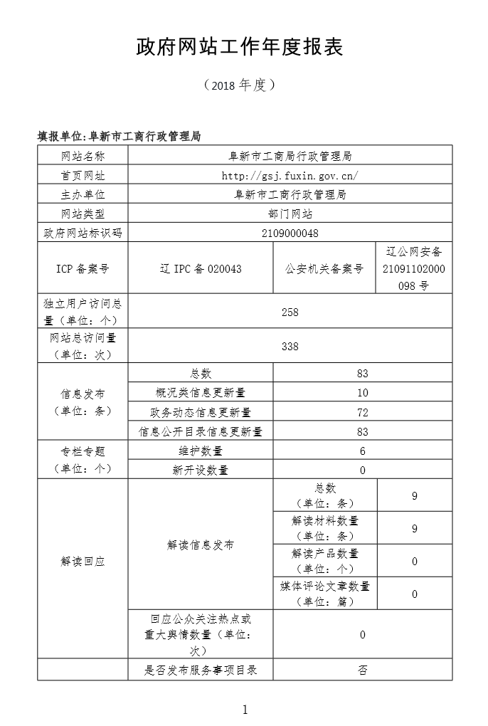 2018年十大正规博彩平台工商行政管理局网站工作年度报表